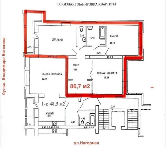 Площадь: 86,7 м2 (с учетом лоджии - 92,75 м2)