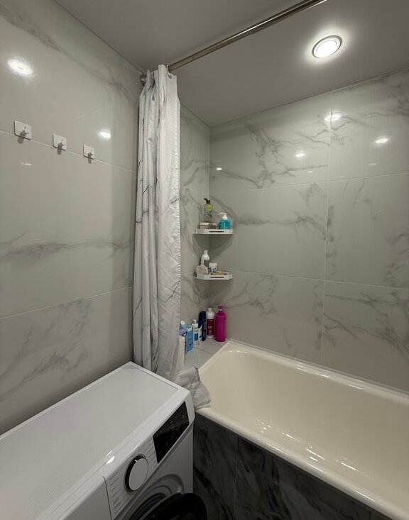 Кухня оборудована современной техникой и стильной мебелью, создавая атмосферу уюта и комфорта. Ванная комната выполнена в светлых тонах.