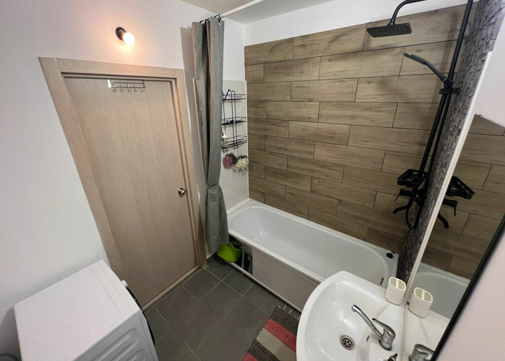 • Большая ванна. Установлена тумба с раковиной. Стены уложены плиткой.