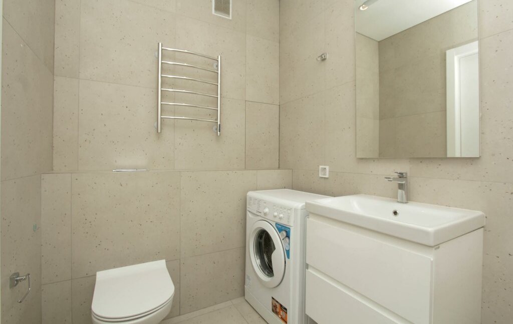 В студии совмещенный санузел с ванной, стиральной машиной, а также раковиной с зеркальной подсветкой.