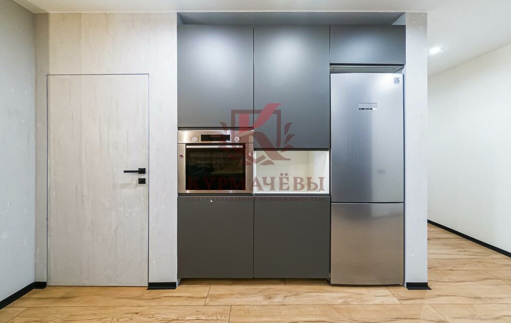 - В кухне-гостиной: кухонный гарнитур разделен на две зоны: шкафы с встроенными электрической варочной поверхностью на 4 конфорки и посудомоечной машинкой; шкафы с встроенным холодильником, духовым шкафом и микроволновой печью. Имеется обеденная зона со дизайнерским столом и стульями.