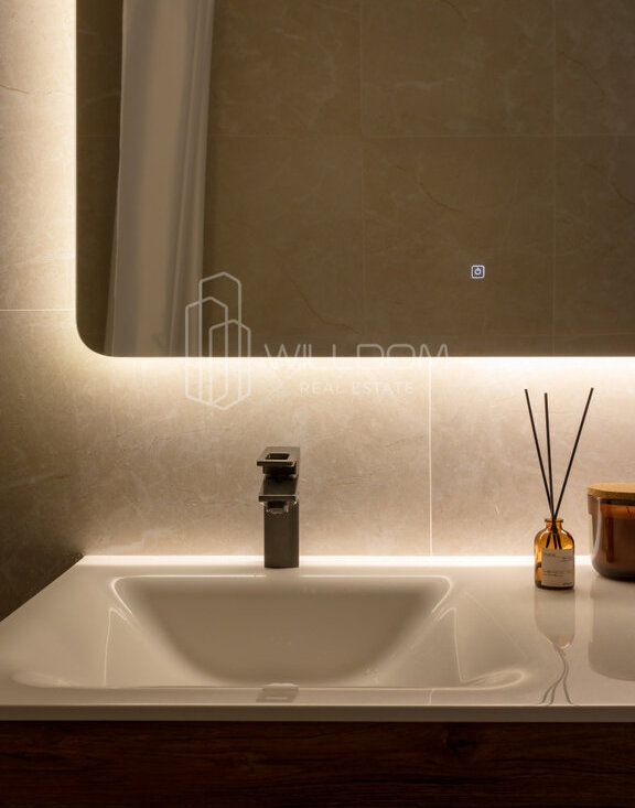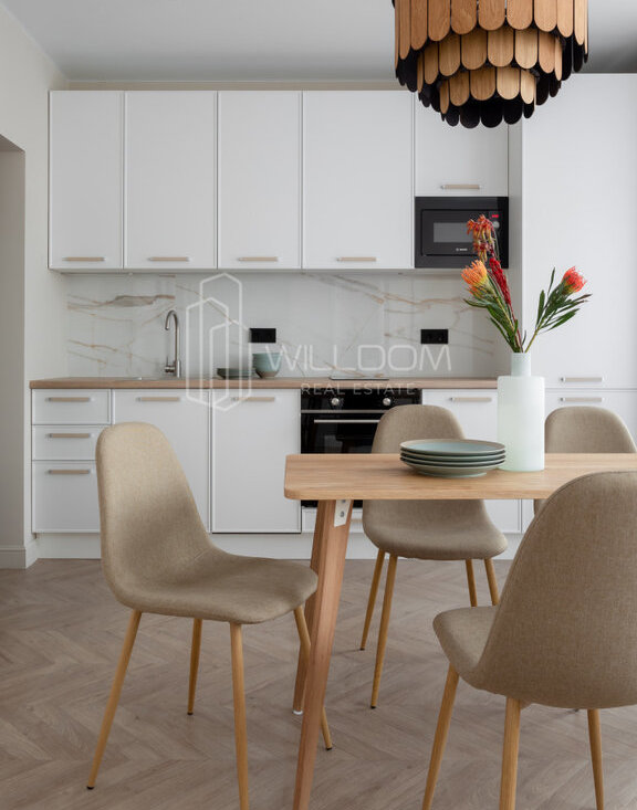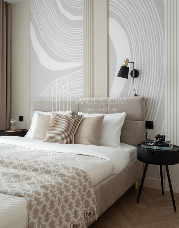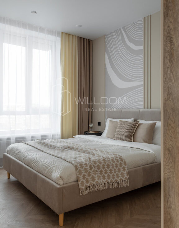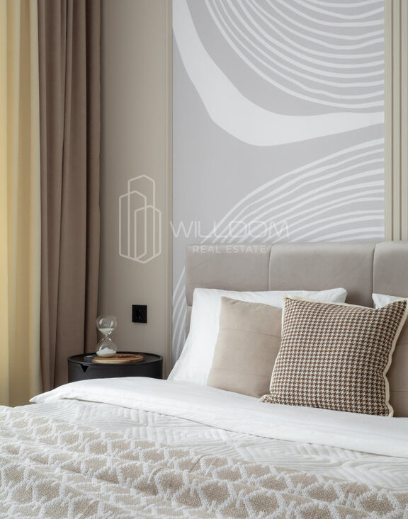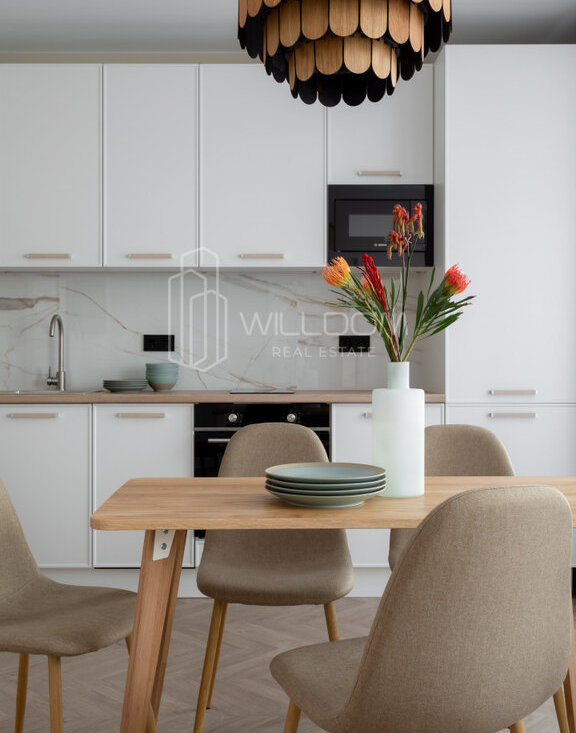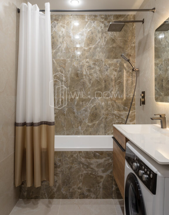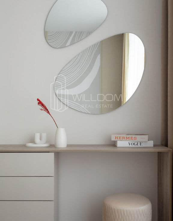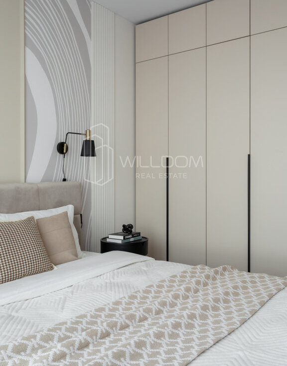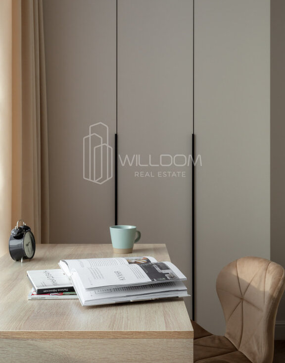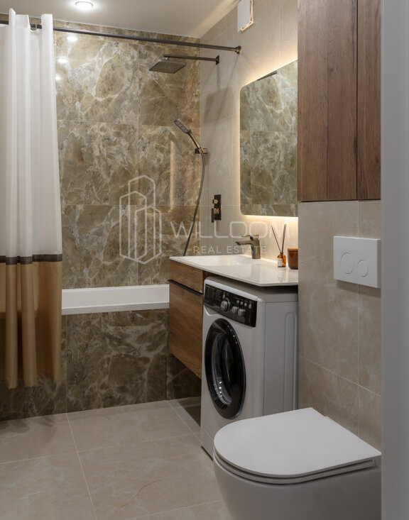 Квартира оснащена всем необходимым для комфортного проживания и полностью готова к заселению: кухня оборудована встроенной техникой (варочная поверхность, духовой шкаф, холодильник, микроволновая печь, посудомоечная машина), в ванной установлена стиральная машина, в гостиной ТВ, а в комнатах предусмотрены места для хранения вещей.