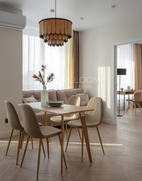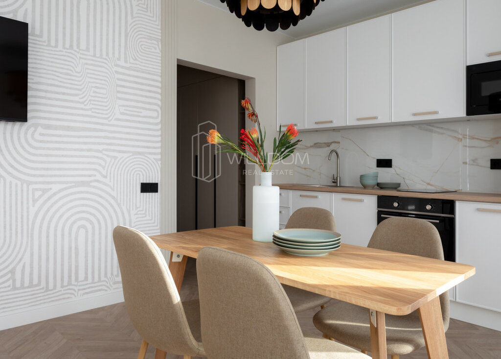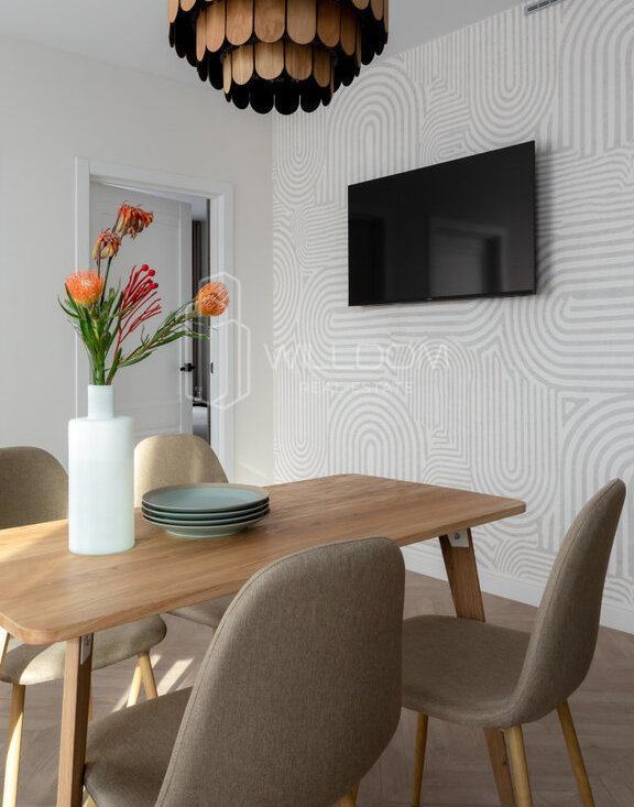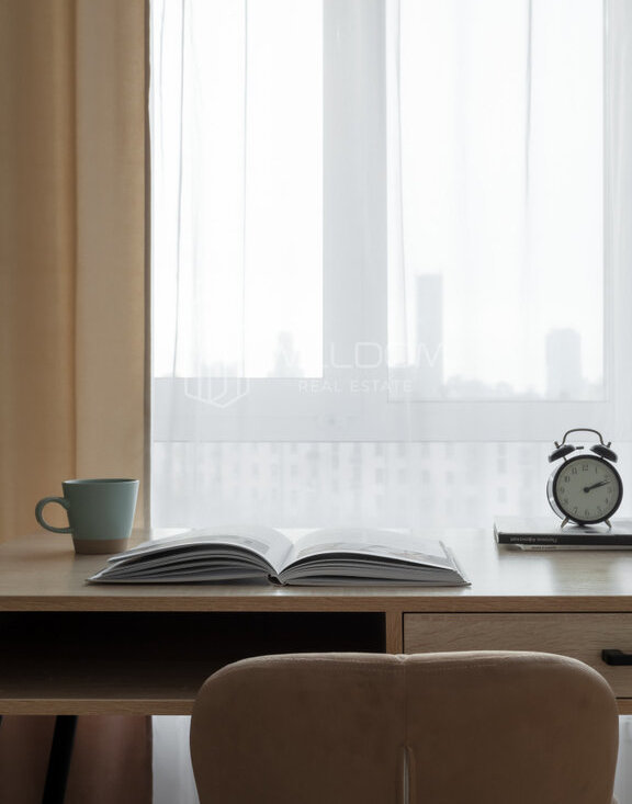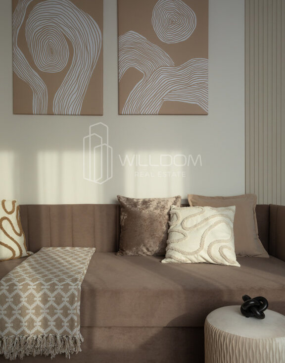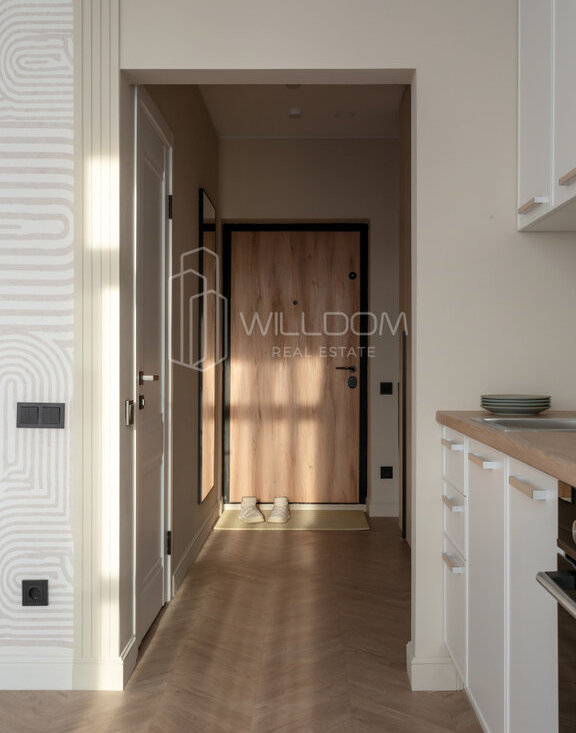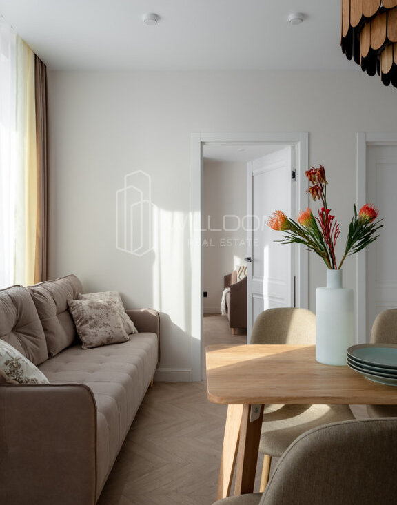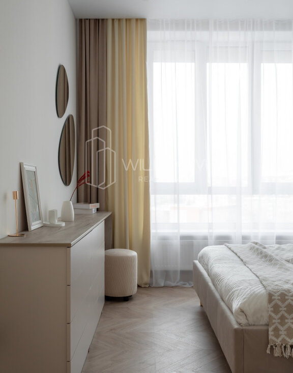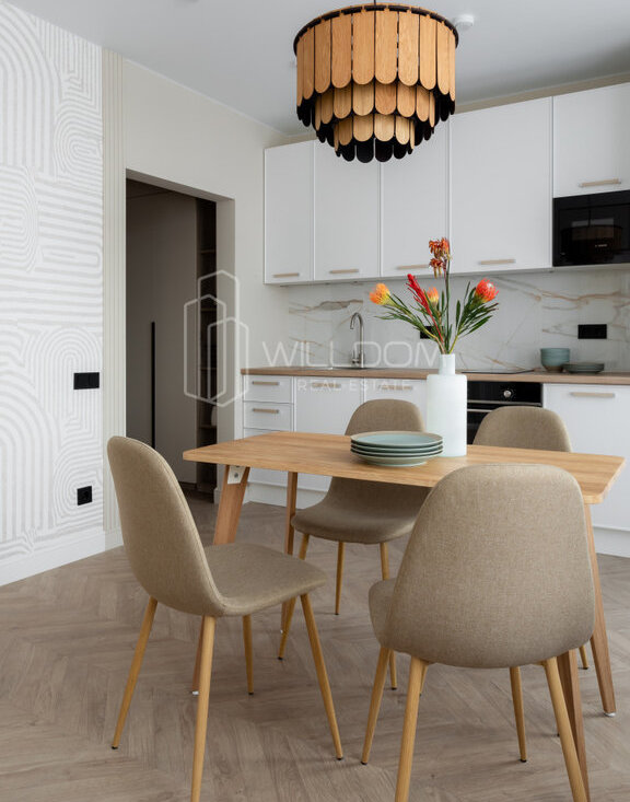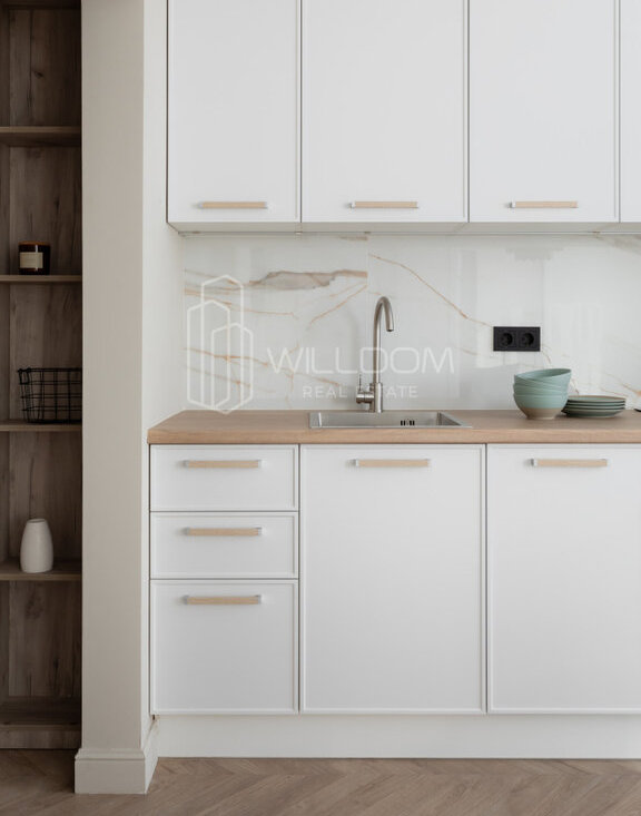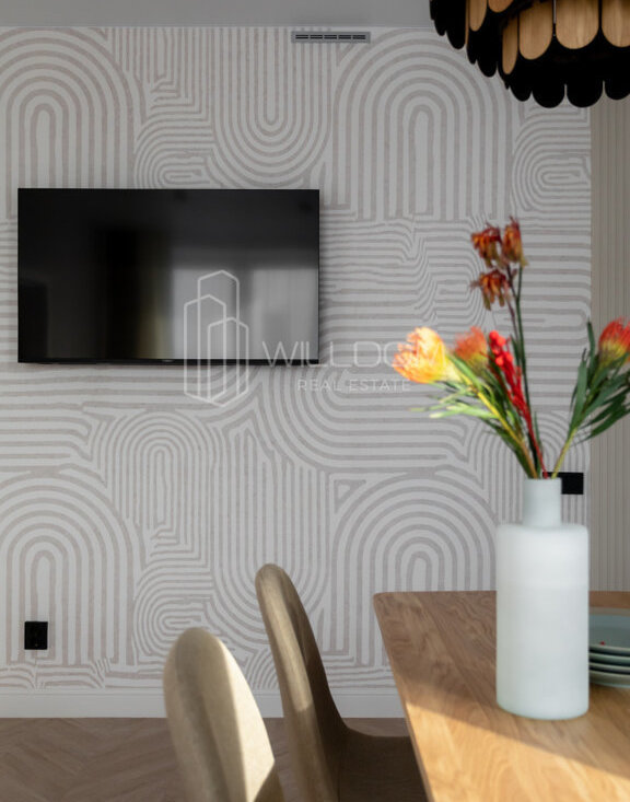 Квартира оснащена всем необходимым для комфортного проживания и полностью готова к заселению: кухня оборудована встроенной техникой (варочная поверхность, духовой шкаф, холодильник, микроволновая печь, посудомоечная машина), в ванной установлена стиральная машина, в гостиной ТВ, а в комнатах предусмотрены места для хранения вещей.