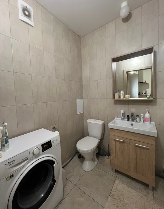 Санузел совмещённый, оборудован душевой кабиной и стиральной машиной. В прихожей предусмотрены вместительные шкафы для хранения вещей.