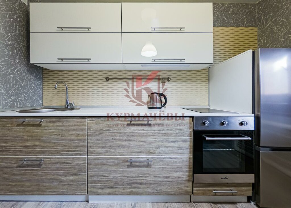 Кухонный гарнитур,электрическая плита с духовым шкафом, холодильник, чайник, стиральная машина, раскладной диван, двуспальная кровать с матрасом, вместительный гардеробный шкаф.