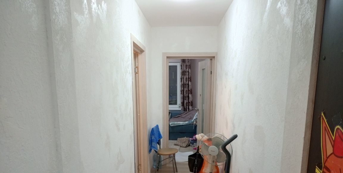 Сделан ремонт,от застройщика остался только ламинат,потолок и двери,в коридоре и туалете сделана декоративная штукатурка под покраску любым цветом,в ванне плитка на стене и полу