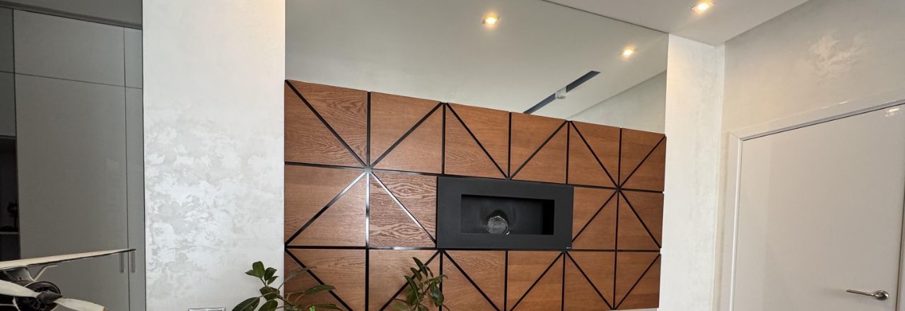 Гостиная: декоративные панели из шпона дуба, биокамин с настоящим огнём, так же есть фоновое декоративное освещение для уютных вечеров.