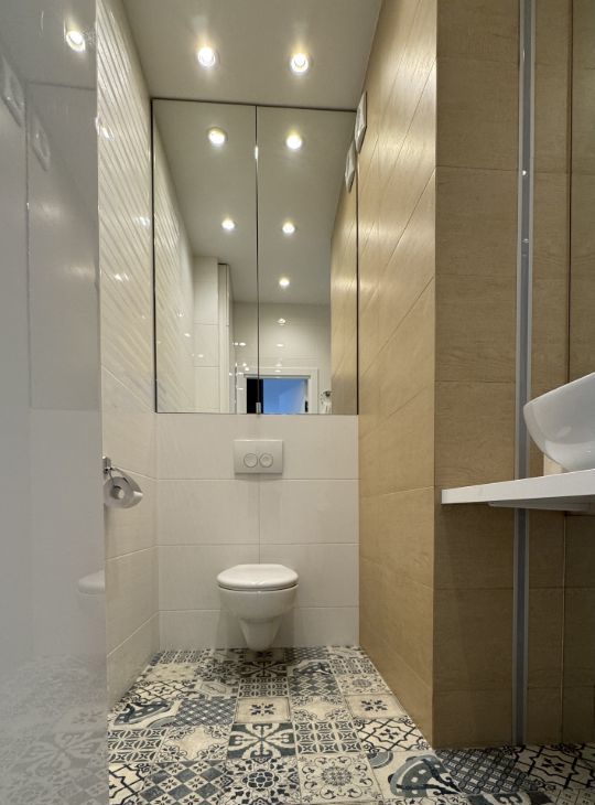 Санузлы: качественная сантехника и керамогранит, чугунная ванна, тропический душ с термостатом, полотенцесушитель, дополнительное зеркало для бритья и подогрев пола.