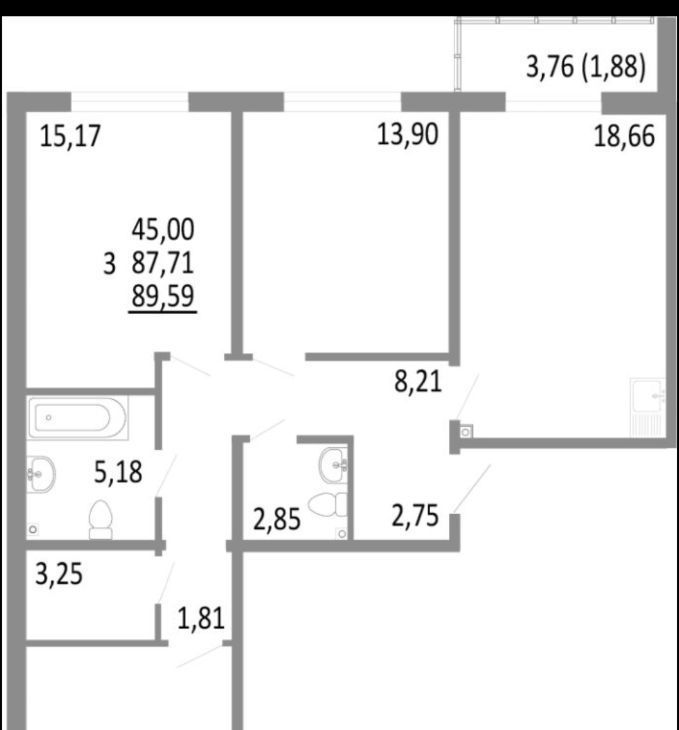 3-к кв. Свердловская область, Екатеринбург бул. Золотистый, 11 (74.0 м²)