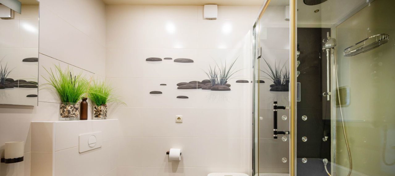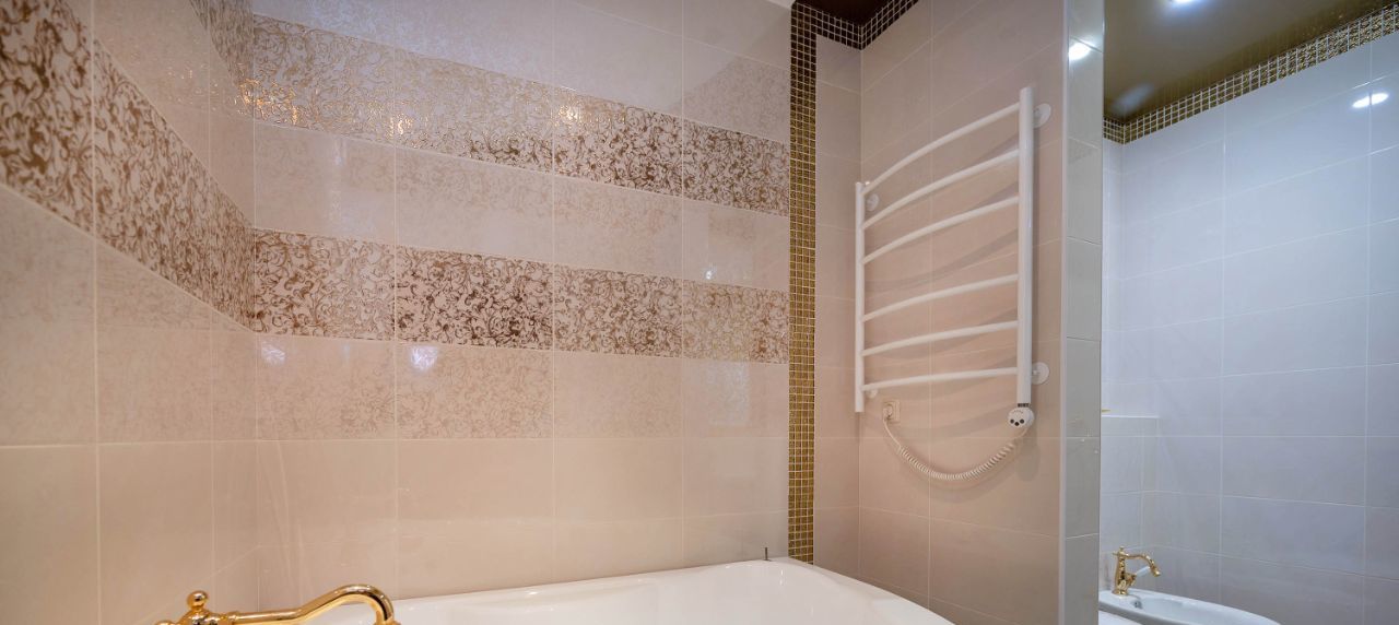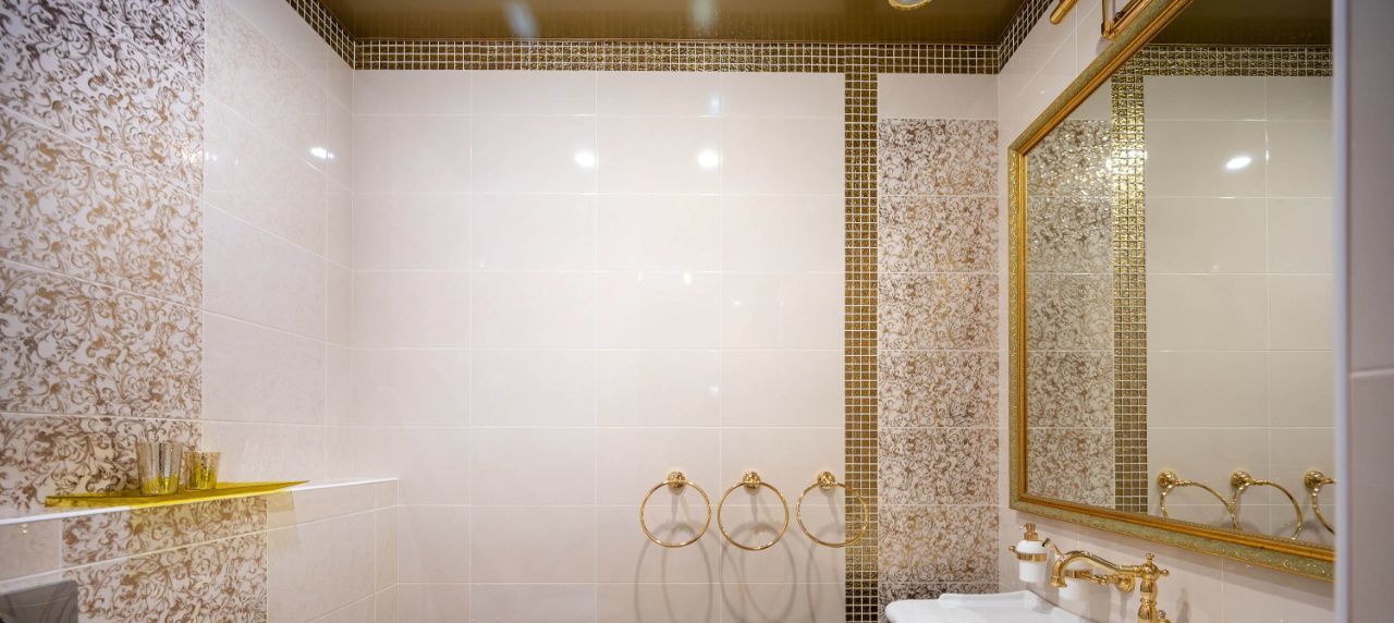 В квартире два сан. узла с сантехникой Jacobs Delafon и теплыми полами: гостевой с душевой кабиной, оборудованной парогенератором (мини сауна для одного человека) и полноразмерной стиральной машиной, второй с мастер спальней, оборудован биде и ванной с гидромассажем, оформлена в светлых тонах с акцентом на золотые элементы декора.