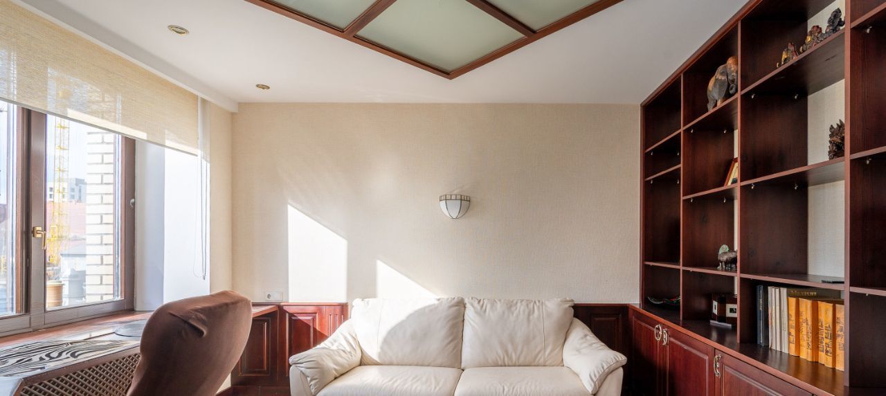 Для главы семьи предусмотрен рабочий кабинет в английском стиле с окном, выходящим во двор, удобным кожаным диваном, который можно разложить в случае необходимости для пары гостей.