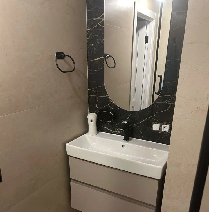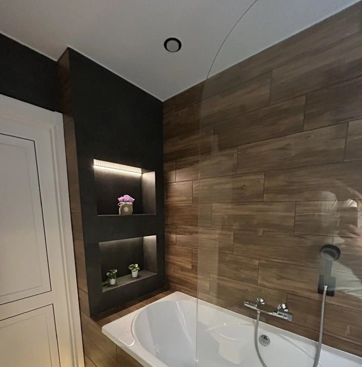 По всей площади квартиры на полу, стенах (кроме спальных комнат) уложен крупноформатный (160х80, 120х60) керамогранит (Italon, Atlas Concorde, Kerama Marazzi).