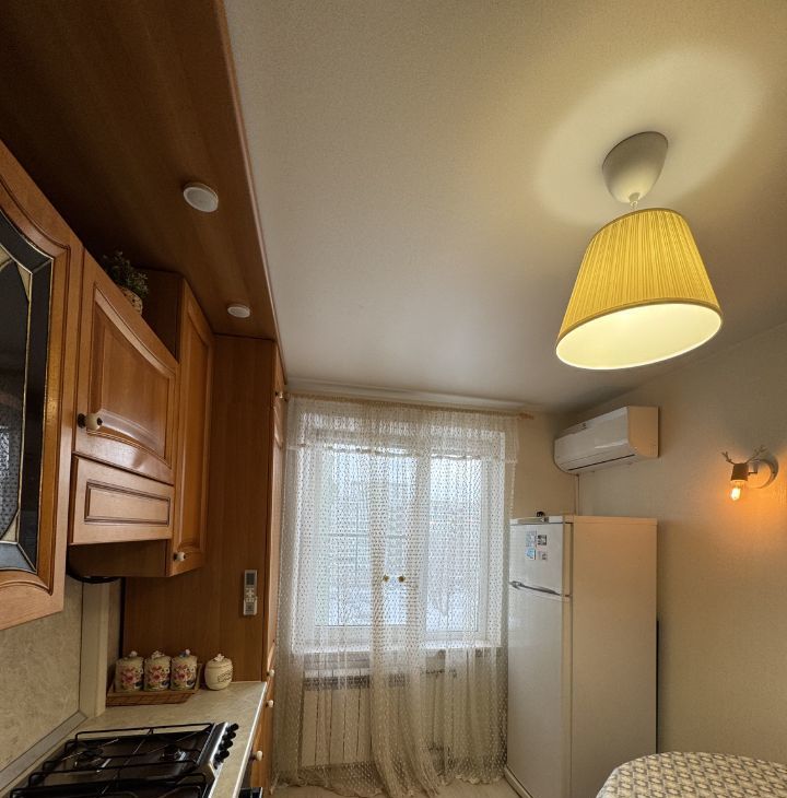 Кухня — отдельная, с классическим гарнитуром в натуральных оттенках дерева, удобной рабочей поверхностью и продуманной системой хранения.