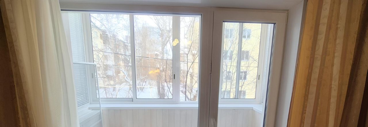 Балкон остеклён и утеплён, имеются жалюзи.