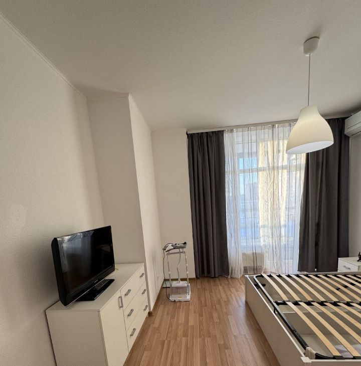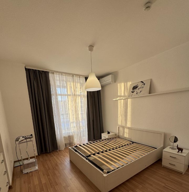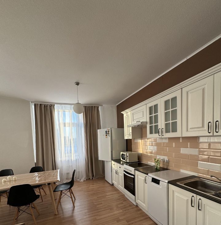 Сдается на длительный срок новая квартира 94 м2 в ЖК Чемпион Парк. Кухня-столовая радиусной планировки (38м2), 2 спальни, гардеробная, санузел с душевой кабиной. Есть лоджия 8,1 м2. Квартира меблирована, есть вся необходимая техника для комфортного проживания: кухонный гарнитур, телевизор, стиральная машина, шкаф-купе, двуспальная кровать, диван, обеденный стол со стульями и пр. Территория двора огорожена, есть детская площадка. Свое место в паркинге.