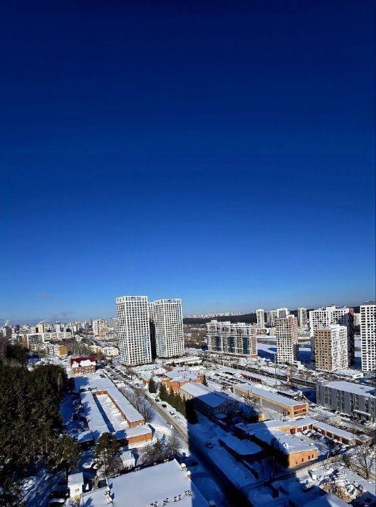 Окна квартиры выходят на южную и западную сторону и наполняют комнаты естественным светом с утра до вечера. Высокий этаж открывает красивый вид и дарит ощущение простора и воздуха.