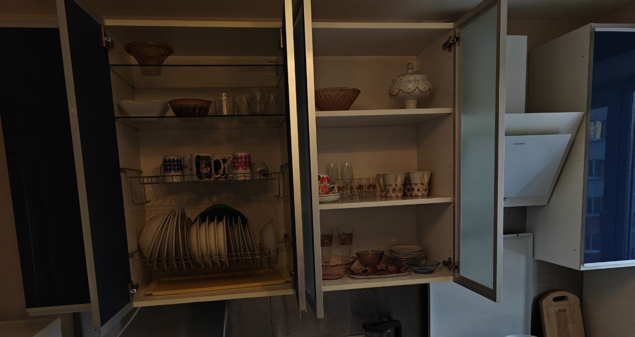 Газовая плита на кухне + вытяжка, холодильник. Полный набор посуды.