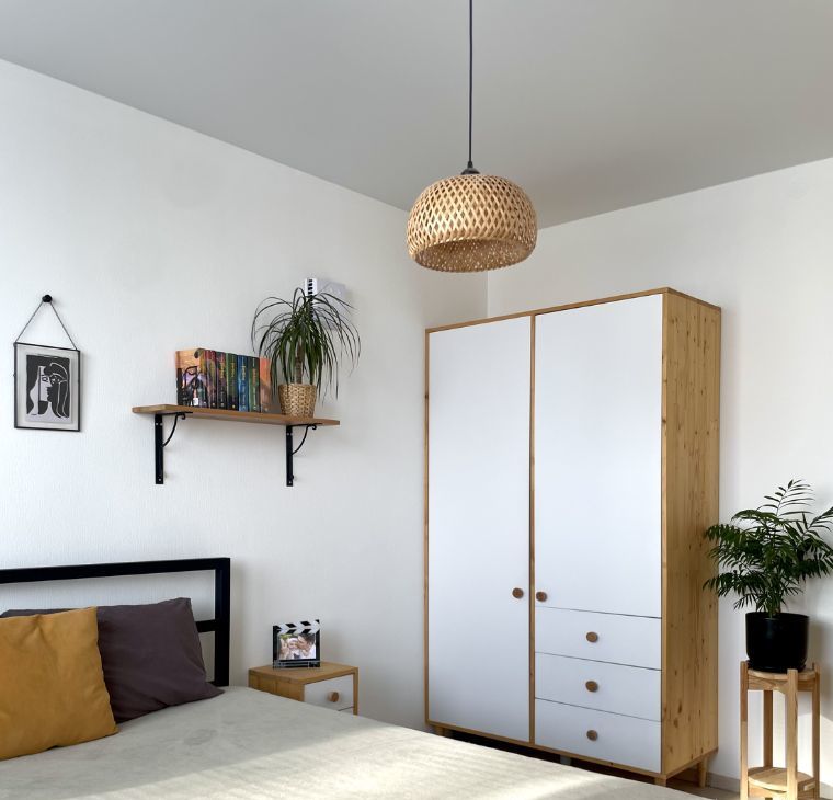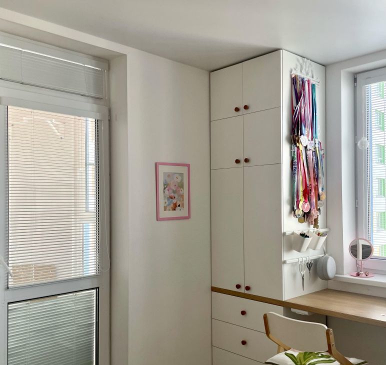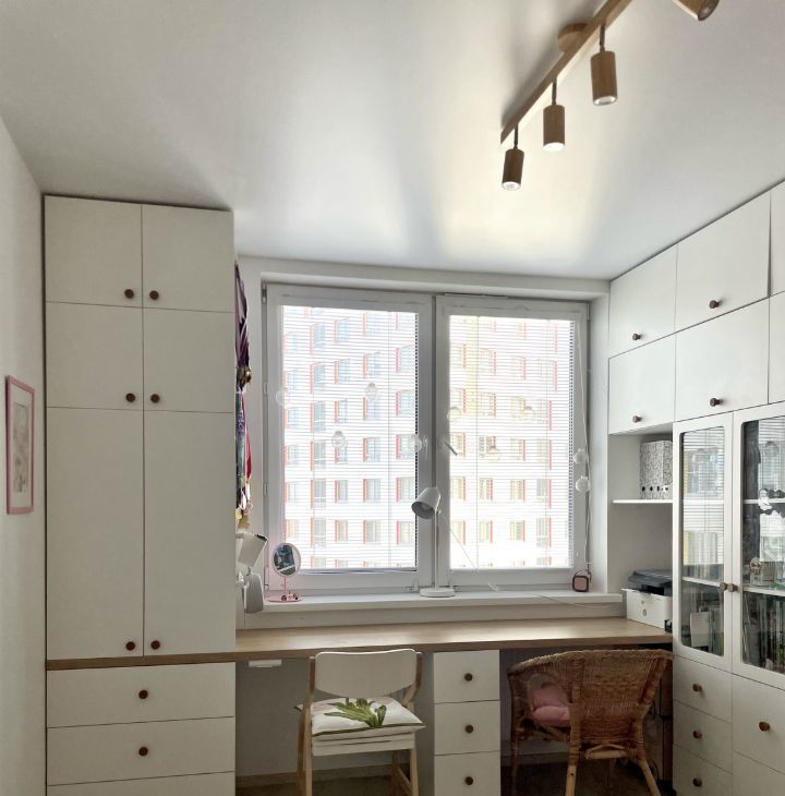 - Две изолированные спальни. Детская комната с грамотным зонированием: кровать-чердак, раздвижная кровать для младшего, большой общий письменный стол на два рабочих места, много систем хранения для игрушек и вещей. Спальня родителей - уютное пространство.