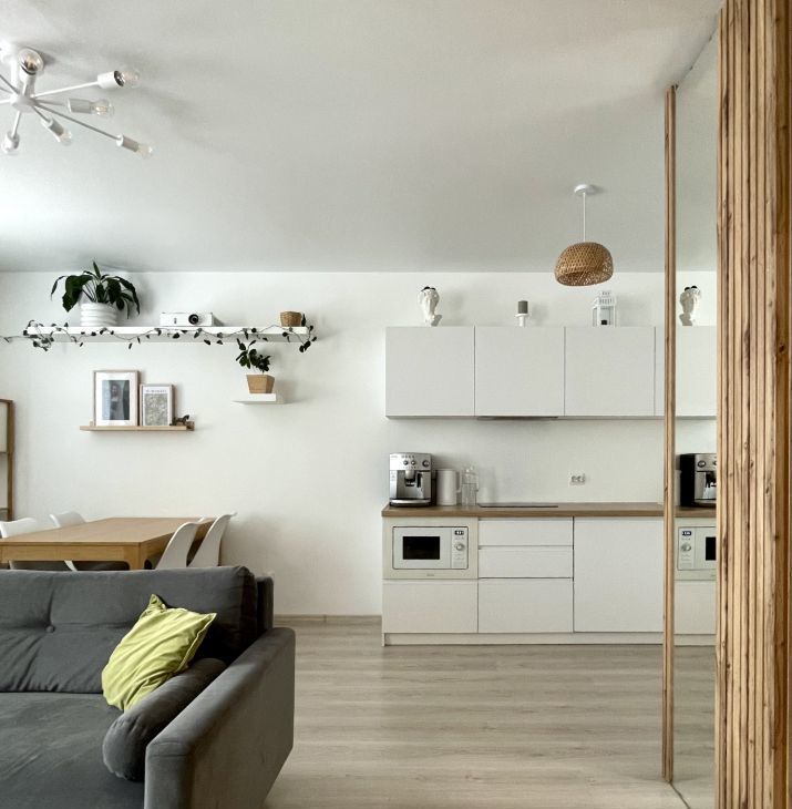 - Большая кухня-гостиная - светлое пространство для семейных праздников, ужинов и отдыха. В гостиной - ортопедический диван-кровать для гостей и обеденная группа.