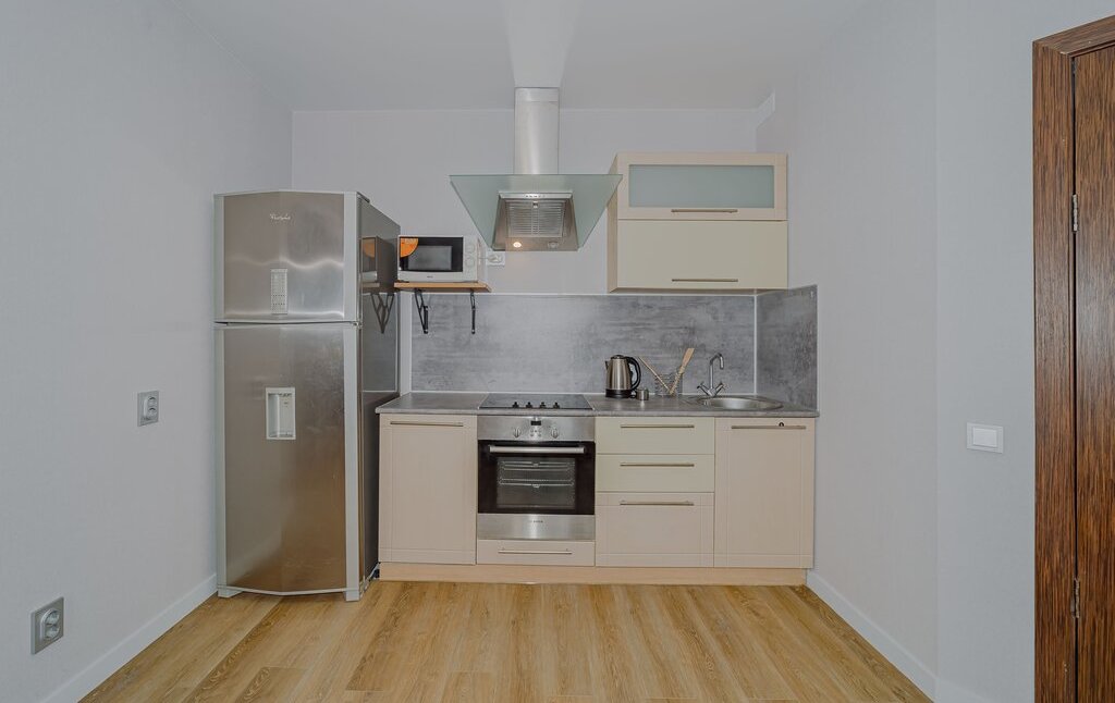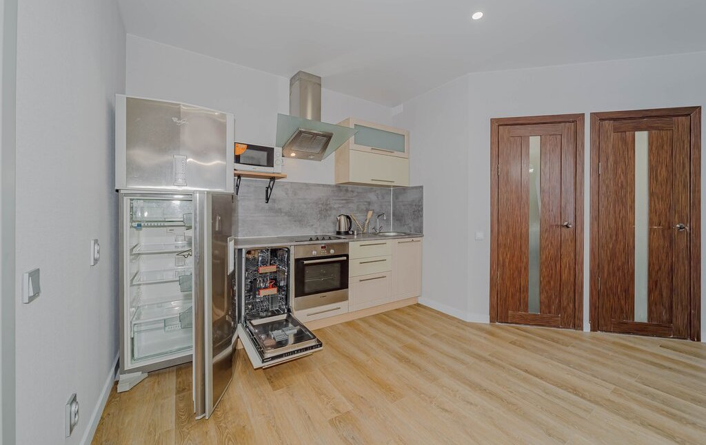 Гостиная: Просторная, совмещена с кухней. Есть удобный диван (раскладывается), обеденный стол для 4-х человек, телевизор и система хранения. Есть холодильник, духовка, плита, посудомоечная машина, чайник, микроволновка.
