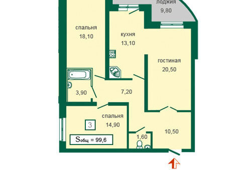 Общая площадь - 100 кв.м. Три комнаты, два санузла. Между кухней и гостиной стены нет. Лоджия - 9 кв.м., выходит на западную сторону.