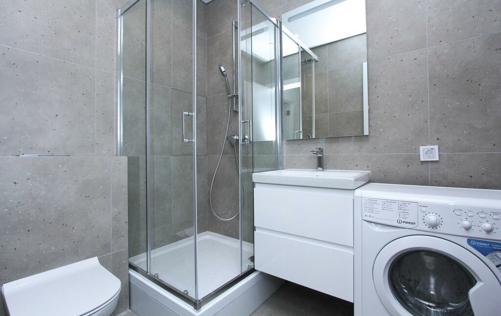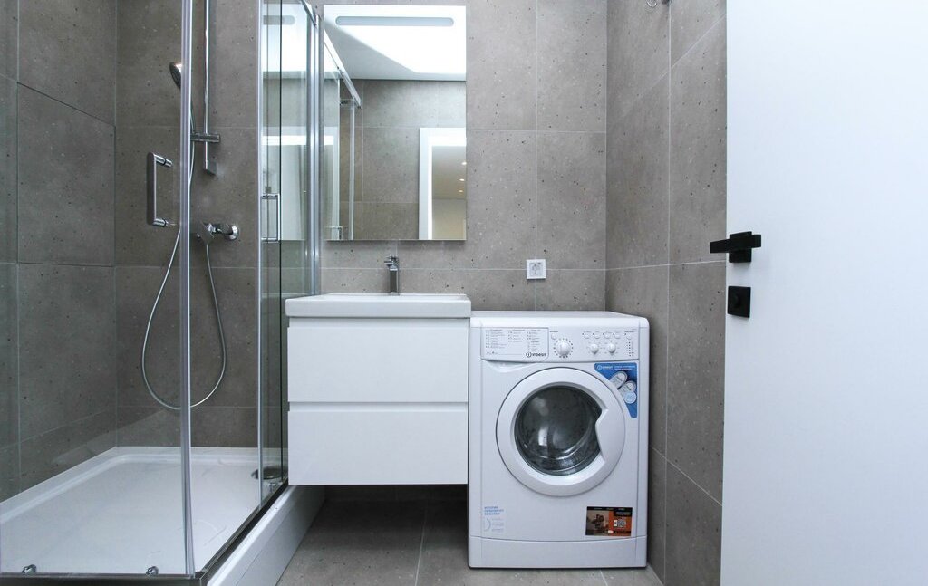 В студии один совмещенный санузел с душевой кабиной, стиральной машиной, а также раковиной с зеркальной подсветкой.