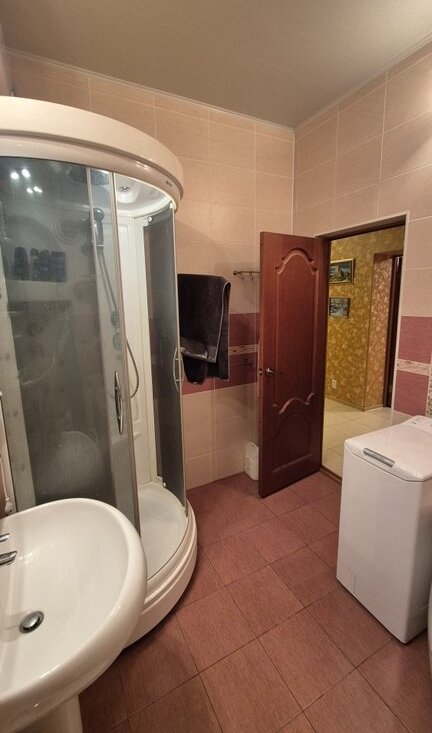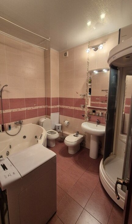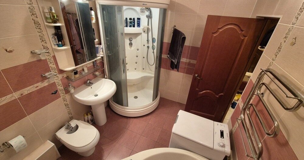 • Большая ванная комната площадью 6,8 кв. м. с душевой кабиной и ванной.