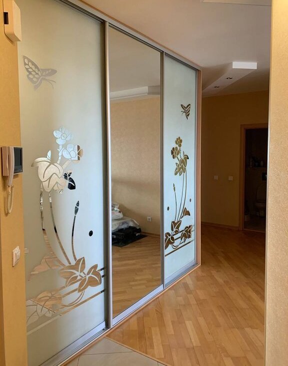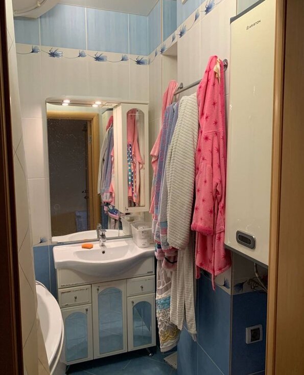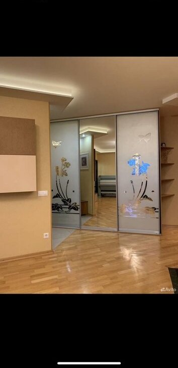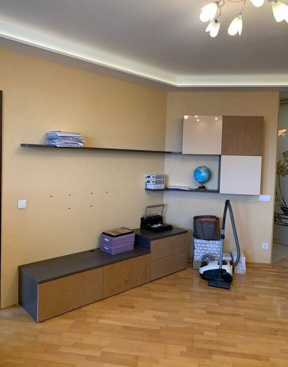 Остается мебель, сделанная на заказ: шкафы-купе в коридоре и на лоджии, рабочий стол с полками и зона ТВ в зале. Кухонный гарнитур без техники. Тумбы с зеркалами в ванной и туалете, два кондиционера.