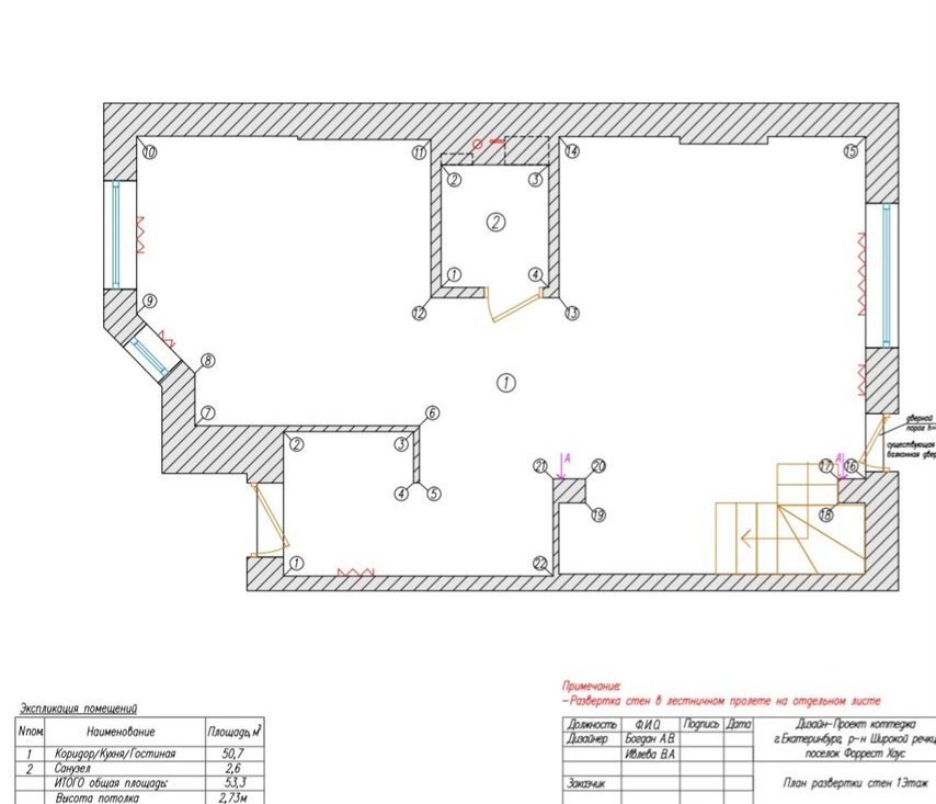 1 этаж: просторная гостиная с кухней, коридор и сан.узел.