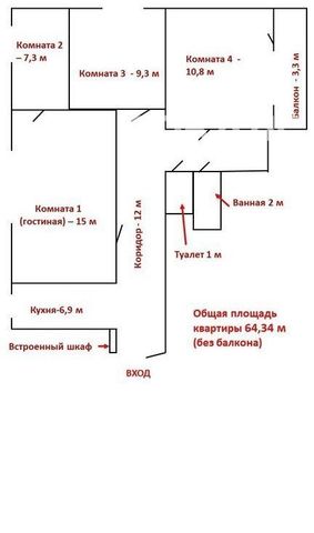 Площадь комнат: 15 м., 7,3 м., 9,3 м., 10,8 м. Площадь балкона - 3,25 (не входит в площадь квартиры).