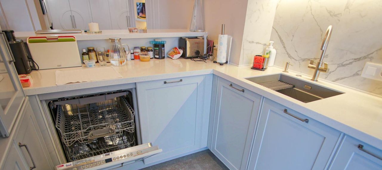 Встроенная кухонная бытовая техника NEFF, вместительный холодильник LIEBHERR, стиральная и сушильная машины MIELE, сантехника FRANKE и Villeroy&Boch.