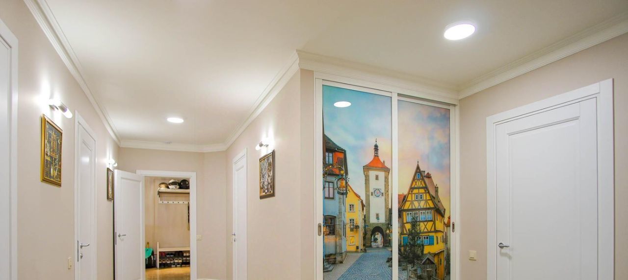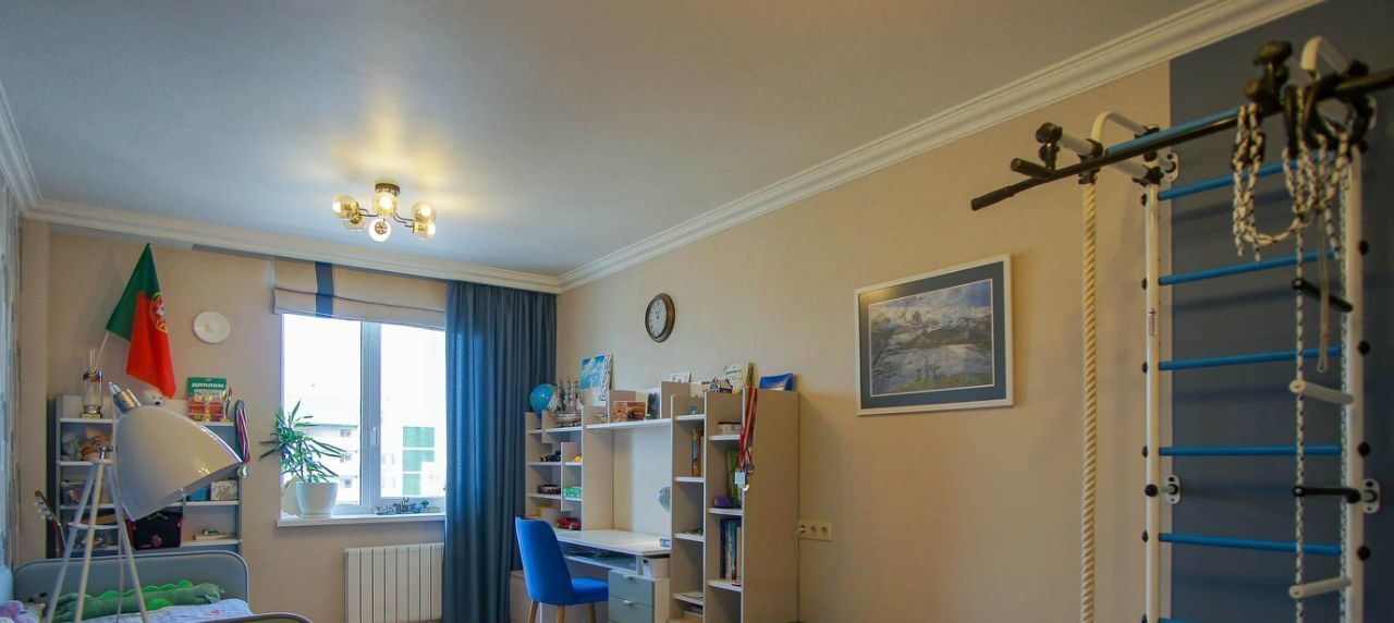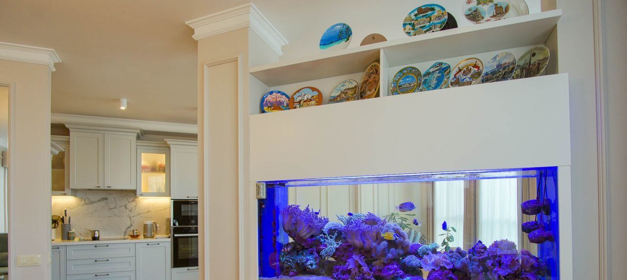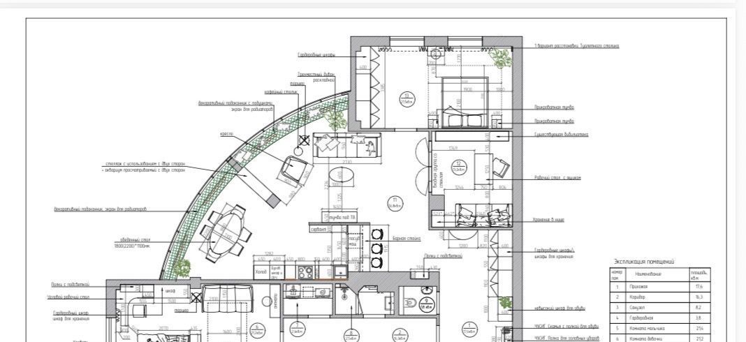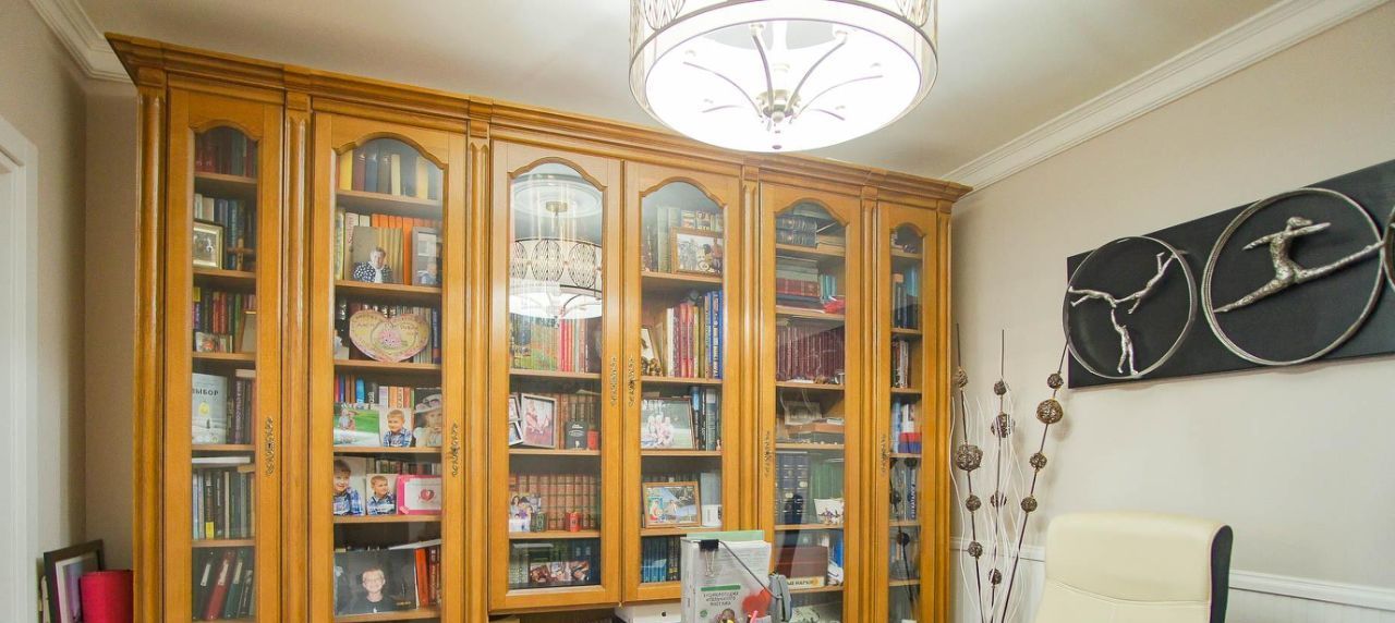 Очень функциональная и удобная планировка квартиры: спальня родителей, 2 детских спальни (для мальчика и девочки), кухня-столовая, отделённая от просторной гостиной 400-литровым морским аквариумом, кабинет с библиотекой, отдельное постирочное помещение, 2 кладовки, вместительные шкафы-купе в коридорах для одежды и вещей, 3 сан.узла, включая ванную и душевую.