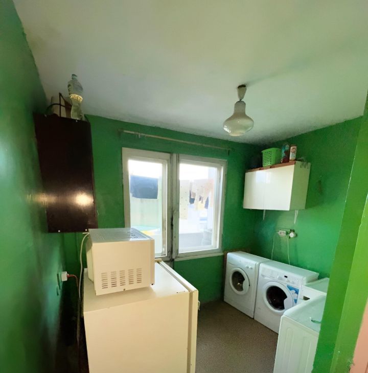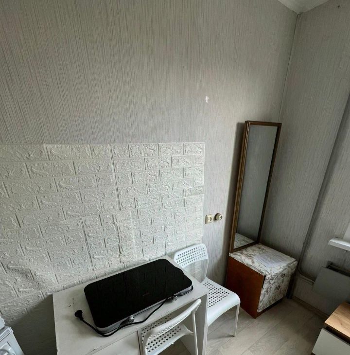 В комнате: диван, холодильник, большой шкаф, зеркало, тумба под телевизор. На кухне стоит своя отдельная стиральная машина (все соседи пользуются своей, никто не лезет в чужую).
