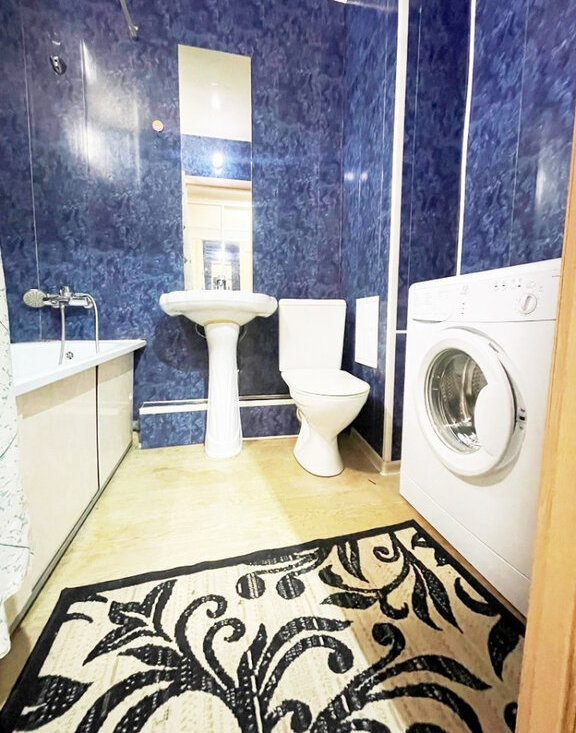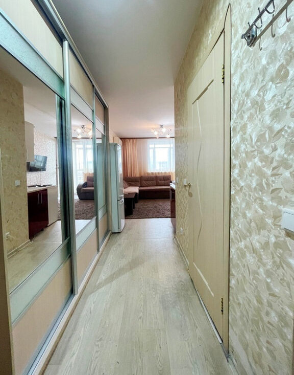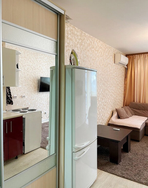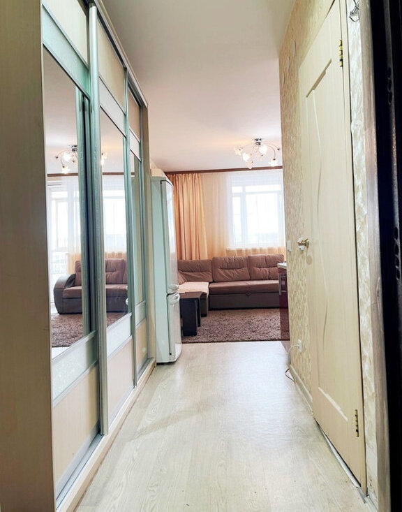 Для жизни есть все необходимое: кухонный гарнитур, холодильник, плита, вместительный зеркальный шкаф купе, телевизор, стол, стиральная машинка.