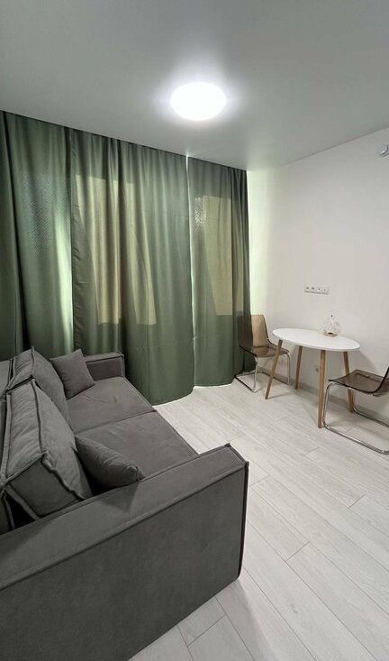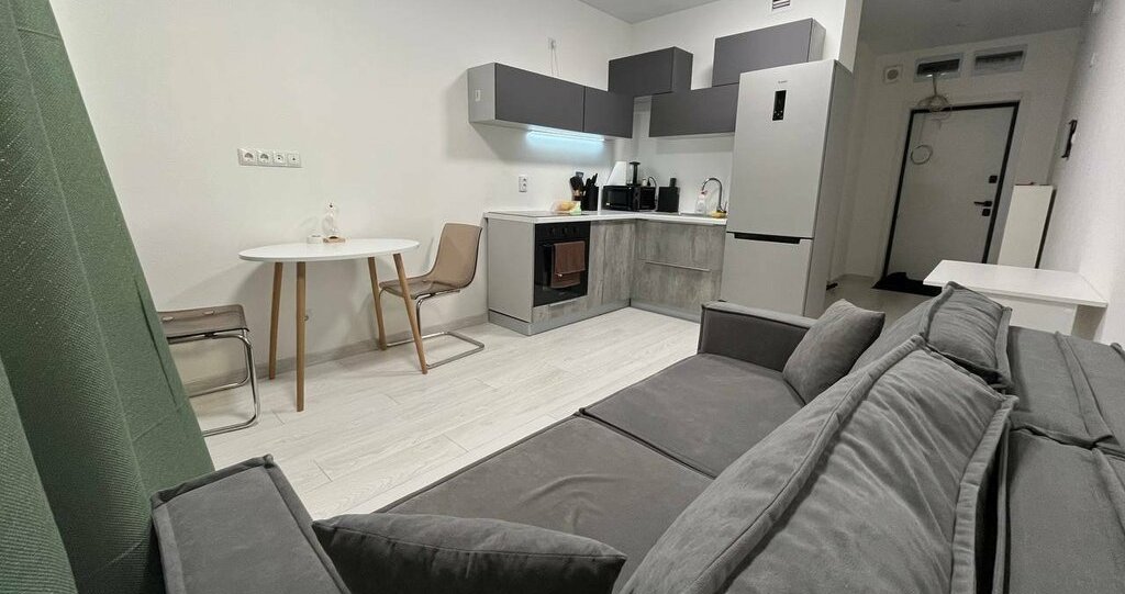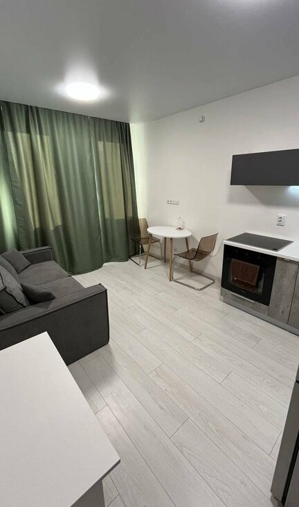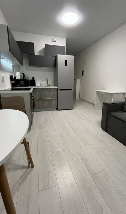 Сдается стильная студия с современным ремонтом в монолитном доме 2025 года постройки. В квартире выполнен евро ремонт, что создает уютную атмосферу. Просторная кухня оборудована всей необходимой техникой, включая холодильник и микроволновую печь. В комнате установлен кондиционер и удобный диван, а также вместительные шкафы для хранения вещей.
