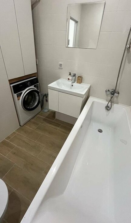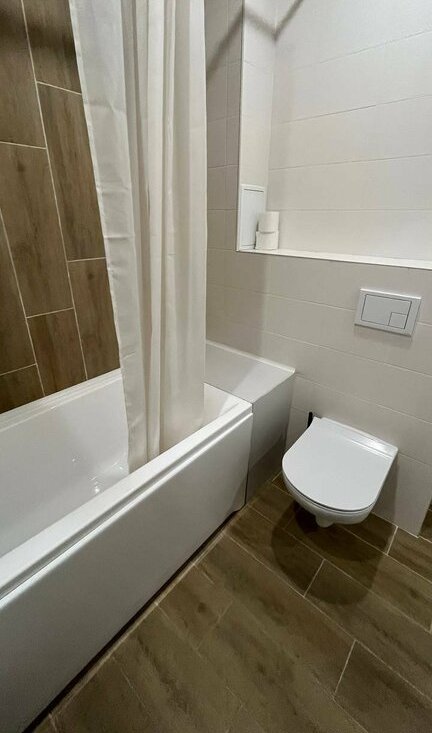 Санузел совмещенный, оснащен ванной и стиральной машиной. В квартире есть все необходимое для комфортного проживания: мебель и бытовая техника. Дом оснащён двумя пассажирскими и двумя грузовыми лифтами, что обеспечивает удобство передвижения.
