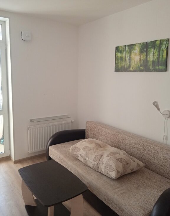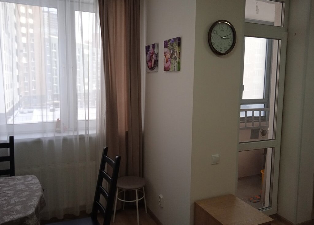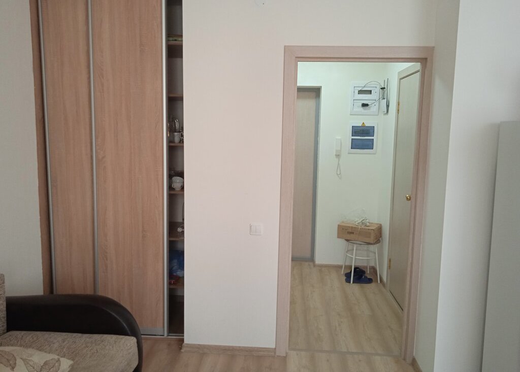 Сдается квартира-студия площадью 25,3 кв. м с остекленной лоджией, с мебелью и бытовой техникой (кухонный гарнитур, холодильник, электрическая плита, комод, два зеркала, стол, стулья, тумба, журнальный столик, диван раздвижной, вместительный шкаф-купе, пылесос, эл. чайник, посуда, настенная вешалка и тумба в коридоре, роутер (вай-фай), шкафчик в санузле, стиральная машина и многое другое).