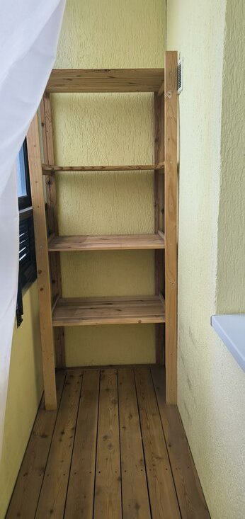 На лоджии установлен стеллаж для возможности дополнительного хранения вещей.