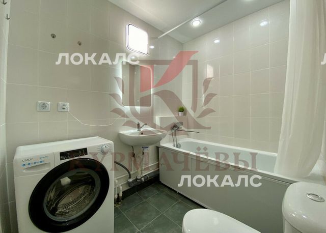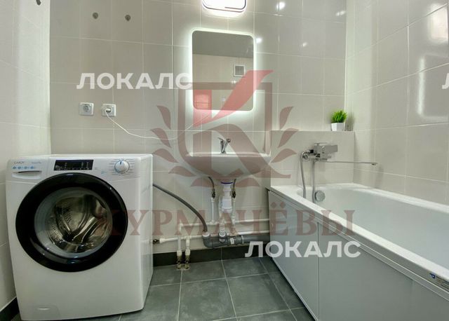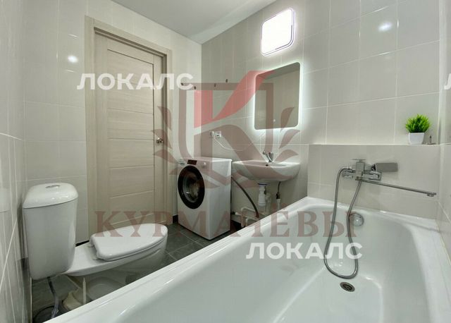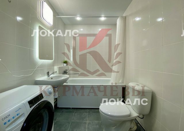 - совмещенный сан. узел в плитке: унитаз, ванная с душем, стиральная машинка, раковина со смесителем и зеркало с подсветкой.