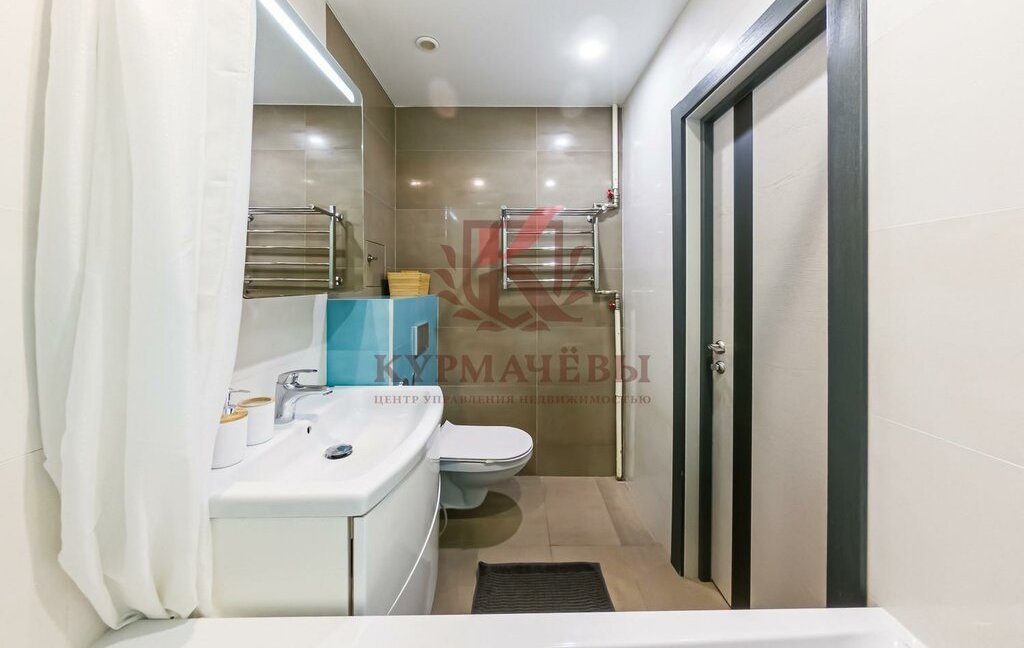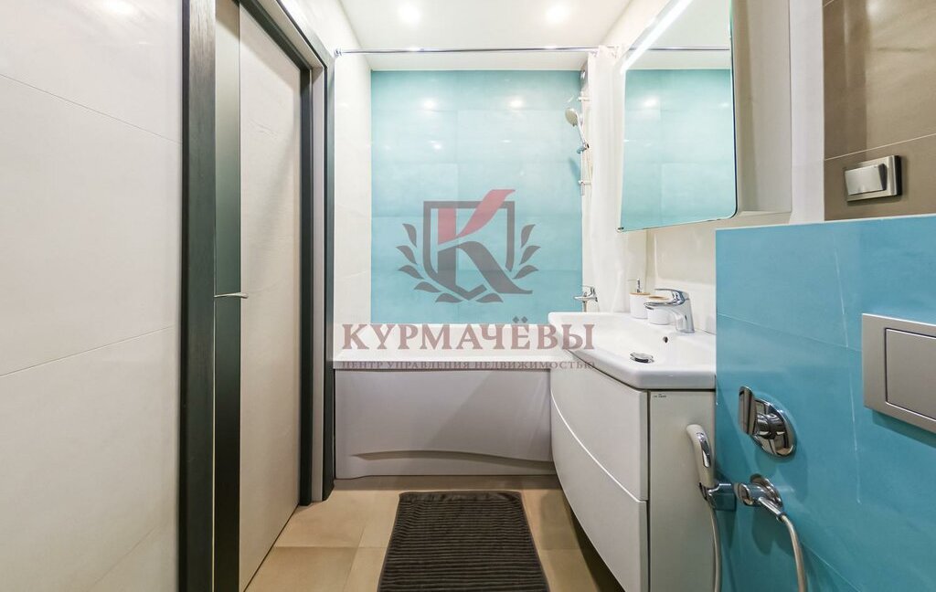 - Сан. узел совмещенный с душевой, имеются: унитаз, раковина со смесителем, шкафчик с зеркалом и подсветкой, навесная тумба под раковиной, ванная с душем и сушилка водяная.