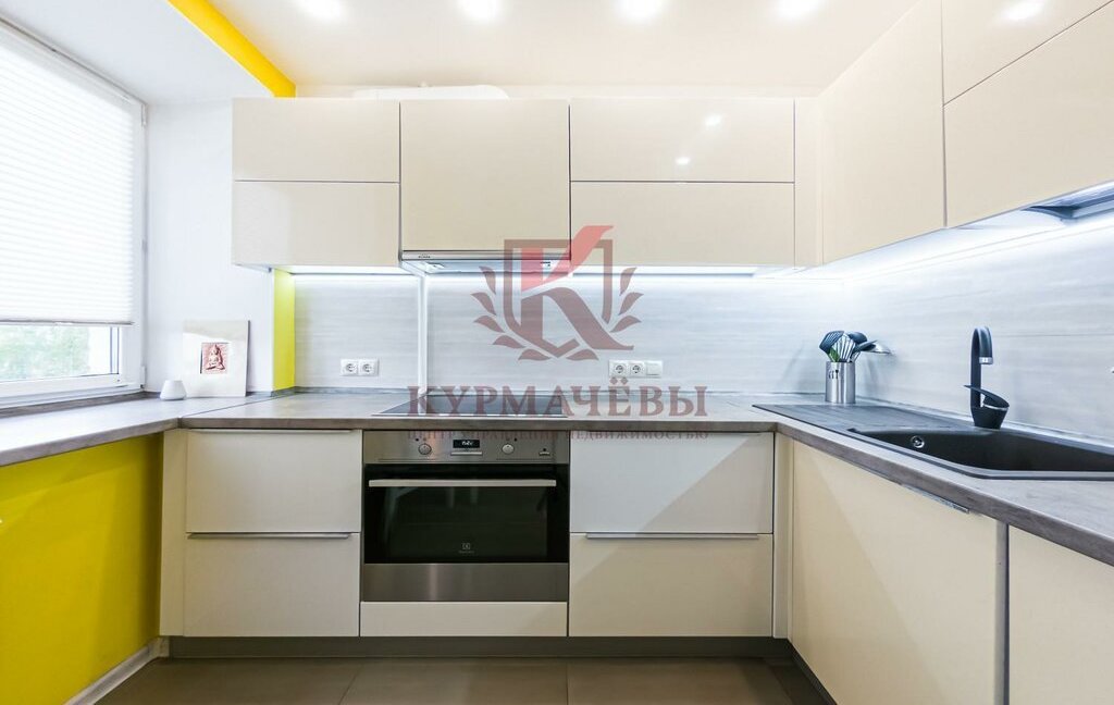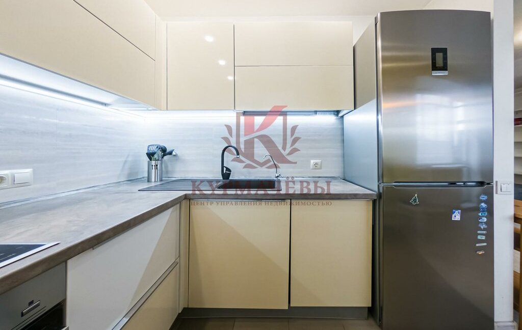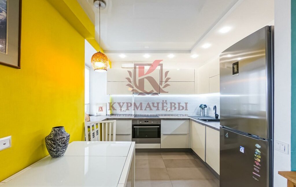 - кухонный гарнитур с подсветкой, электрическая варочная поверхность с духовым шкафом, вытяжка, посудомоечная машина, чайник, холодильник. Имеется обеденный стол и стулья. К смесителю для воды подключен фильтр очистки воды.