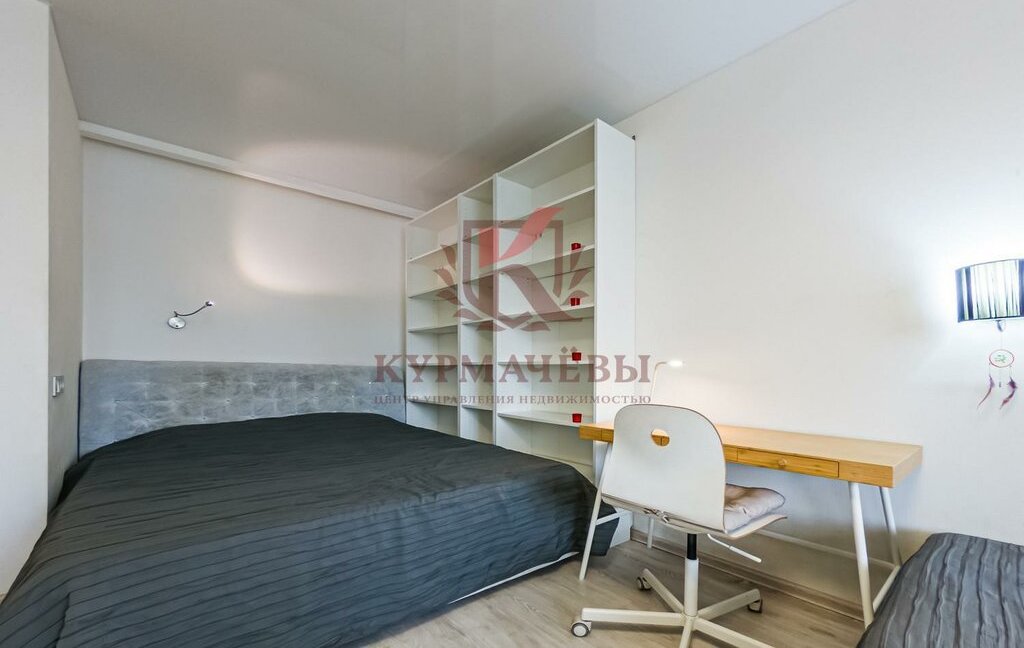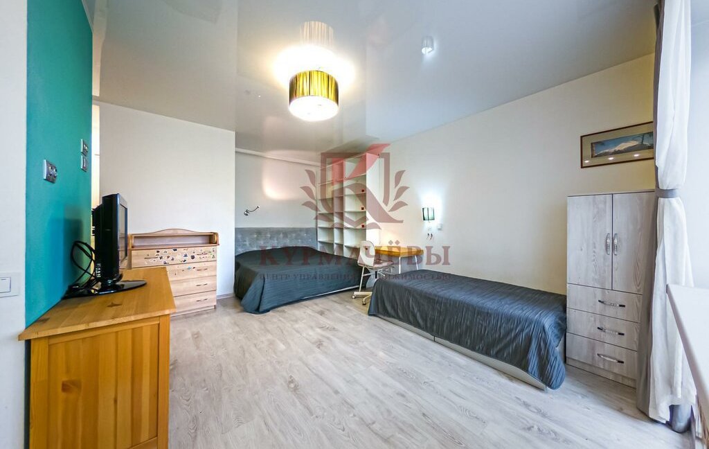 - в зоне отдыха установлена двуспальная кровать с изголовьем и матрасом, стеллаж с множеством полок, рабочий стол со стулом, односпальная кровать с матрасом, тумба под телевизор, телевизор, небольшой шкафчик, комод.
