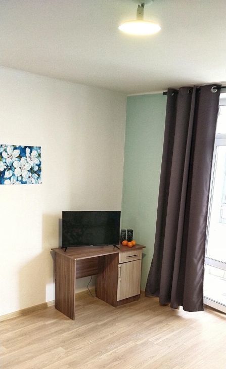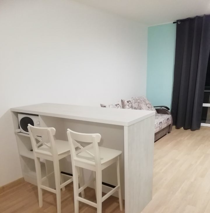 В квартире выполнен евроремонт, что создаёт атмосферу уюта и стиля. Просторная студия обставлена мебелью: на кухне и в комнате, поэтому можно сразу заселяться. Из техники есть всё необходимое: холодильник, телевизор, стиральная машина,микроволновая печь, бойлер. Санузел совмещённый, в ванной комнате установлена ванна. Окна выходят во двор, поэтому в квартире тихо и спокойно, так как двор без машин.
