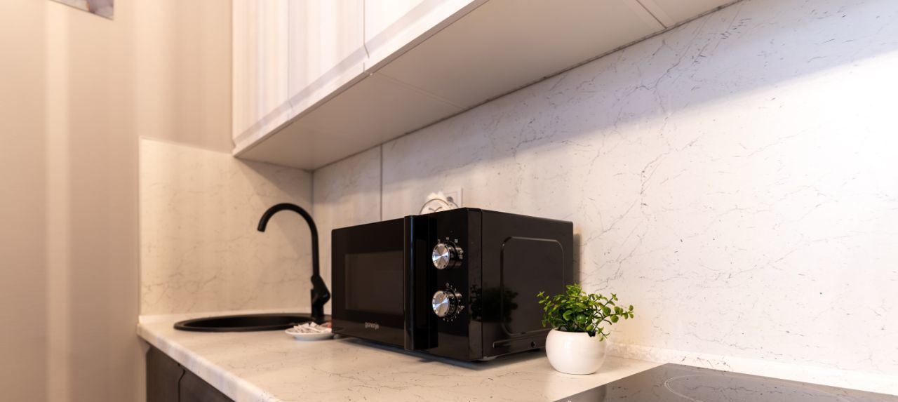 Полноценная кухня: вся необходимая бытовая техника и посуда.