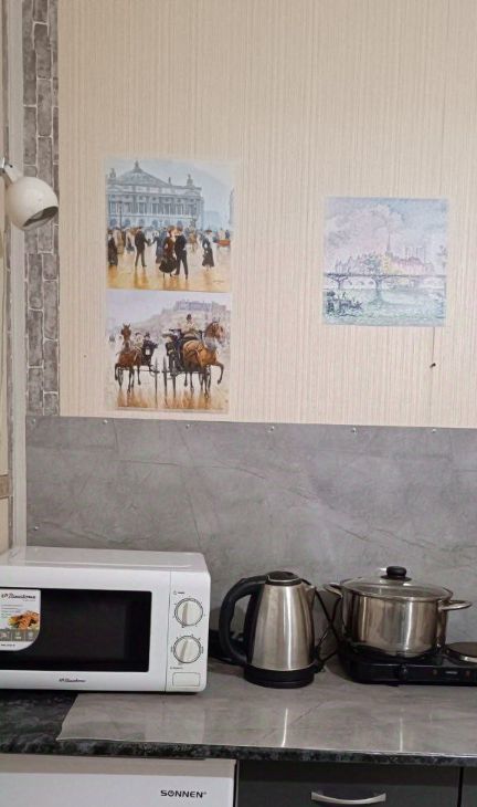 Кухонный гарнитур, стол, холодильник, микроволновка, шкаф для одежды,