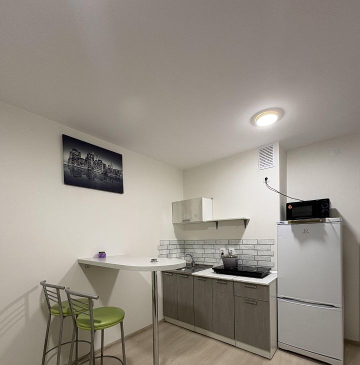 Квартира после свежего ремонта, что делает ее еще более привлекательной для проживания. В студии есть вся необходимая мебель как на кухне, так и в комнате. Из техники имеется холодильник, плита, микроволновая печь и стиральная машина.