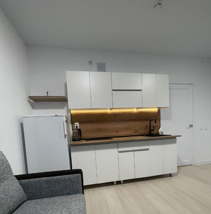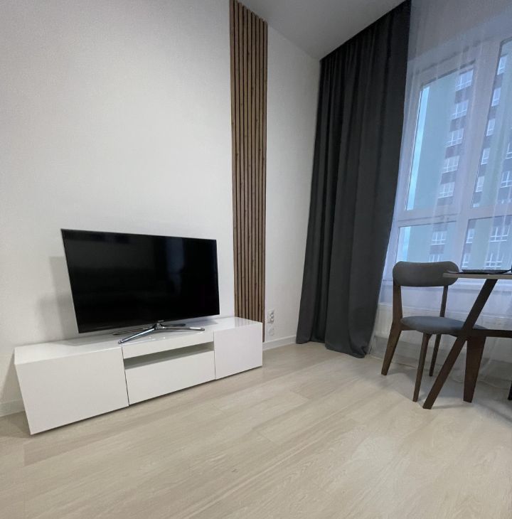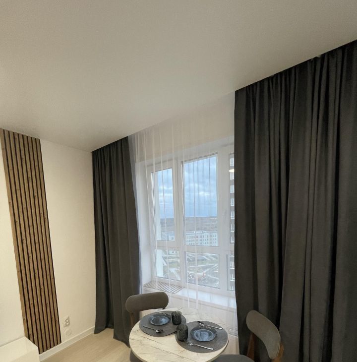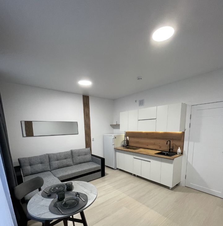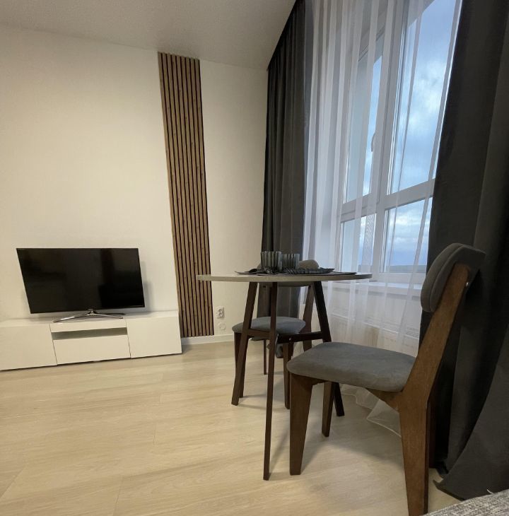 Сдаётся стильная квартира-студия с дизайнерским ремонтом в современном жилом комплексе. Площадь квартиры составляет 24,4 кв. м, расположена она на 16 этаже из 25. Высота потолков — 2,7 метра. Окна выходят во двор, что обеспечивает тишину и спокойствие. Просторная кухня площадью 20 кв. м позволяет удобно готовить и принимать гостей.