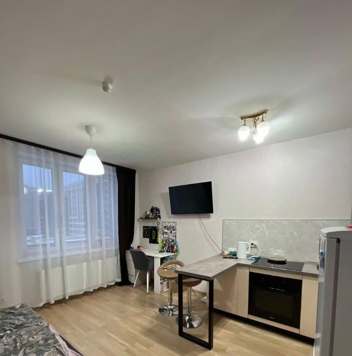 В квартире выполнен ремонт. Просторная жилая зона включает в себя кухню с необходимой бытовой техникой, включая холодильник, микроволновку, чайник, варочную панель, духовой шкаф. Есть фильтра питьевой воды со сменными картриджами. Есть Wi-Fi. В комнате располагается барная стойка с двумя стульями, письменный стол с креслом, диван, турник, крепление под телевизор.(телевизора нет) Также имеется удобный шкаф в потолок для хранения вещей.