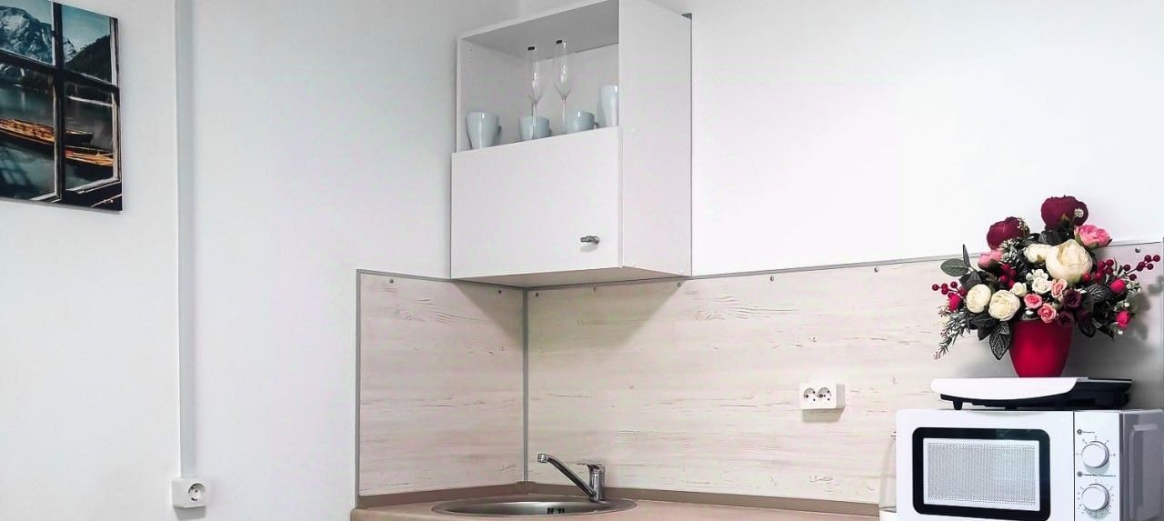 На кухне есть все, что необходимо для приготовления пищи - чайник, микроволновка, плита, посуда.