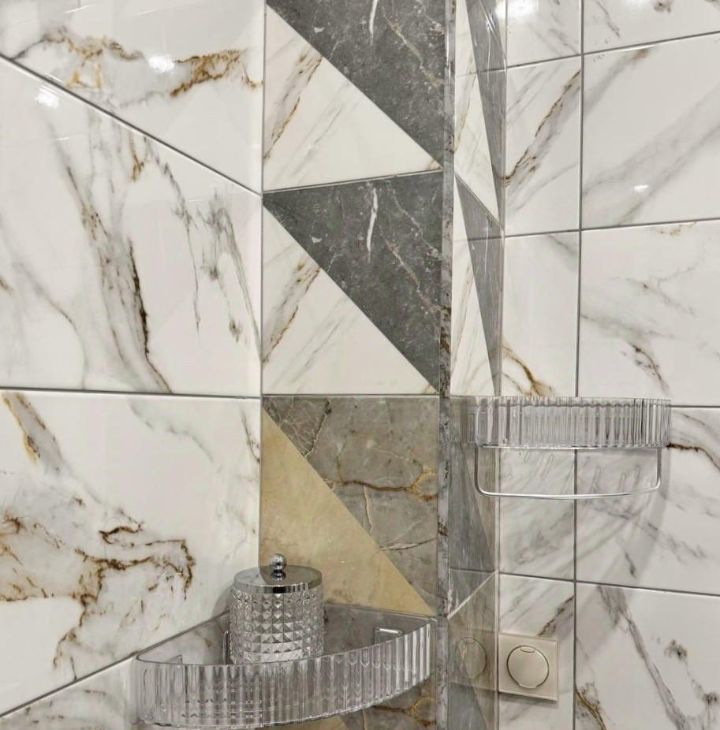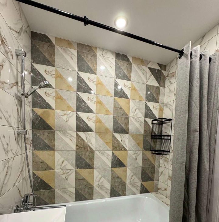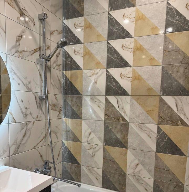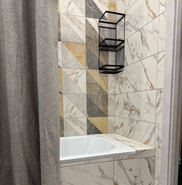 Современная ванная комната: качественная плитка, стильная сантехника, ванна облицована плиткой, система хранения под раковиной.